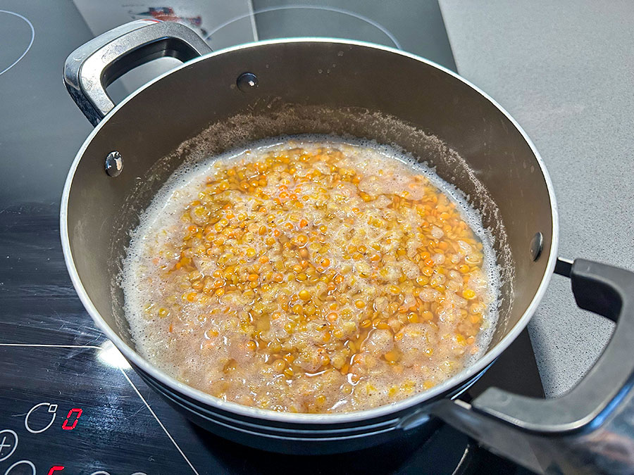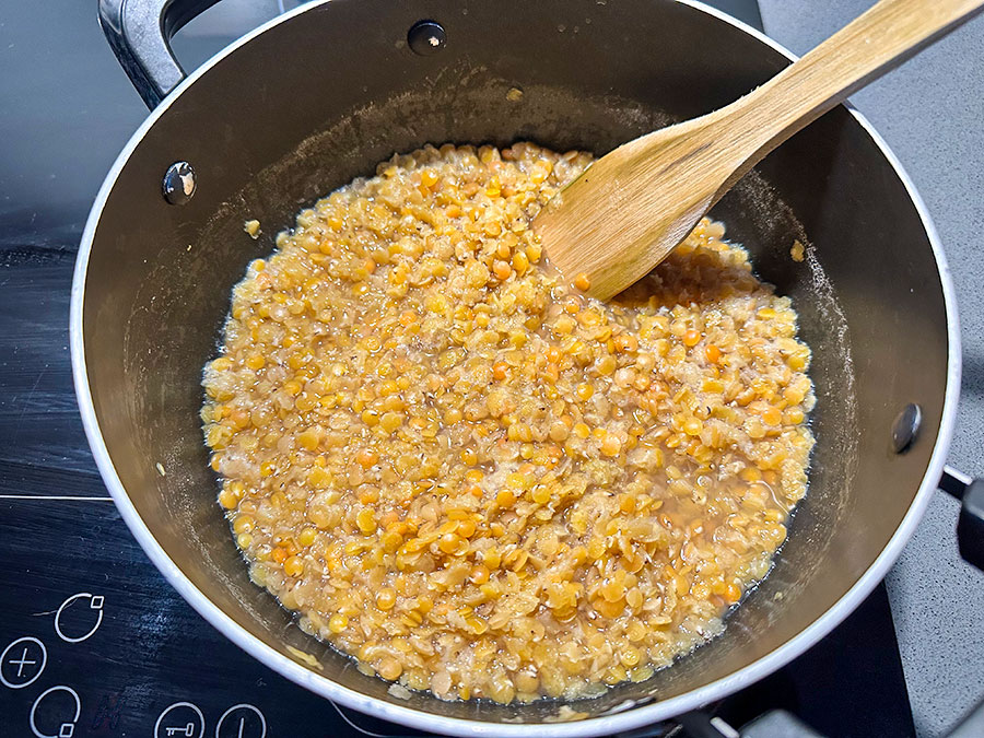 Rinse the red lentils thoroughly and place them in a medium saucepan. Add the water and bring to the boil. Reduce the heat and simmer until the lentils are completely soft and have absorbed most of the liquid.