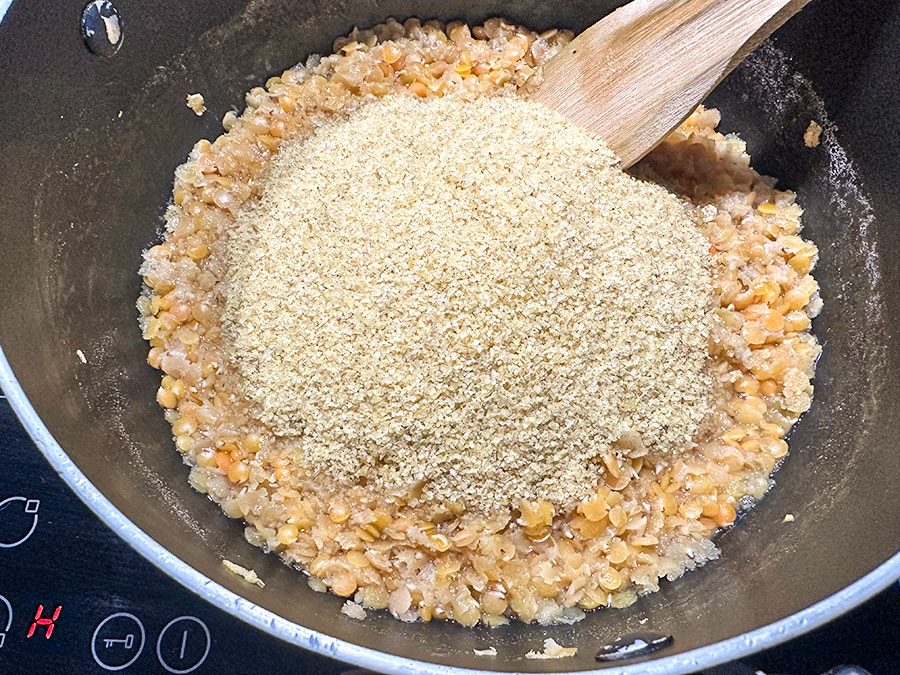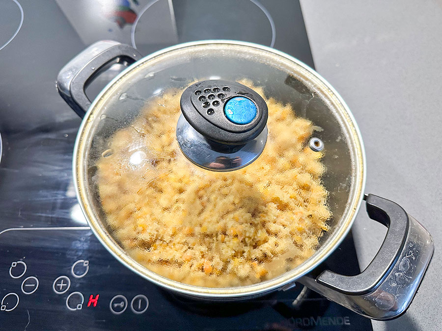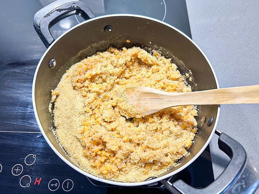 Once the lentils are cooked, add the bulgur directly to the pot, stir well, cover with a lid and leave to rest for about 30 minutes so the bulgur can soften and absorb the remaining moisture.