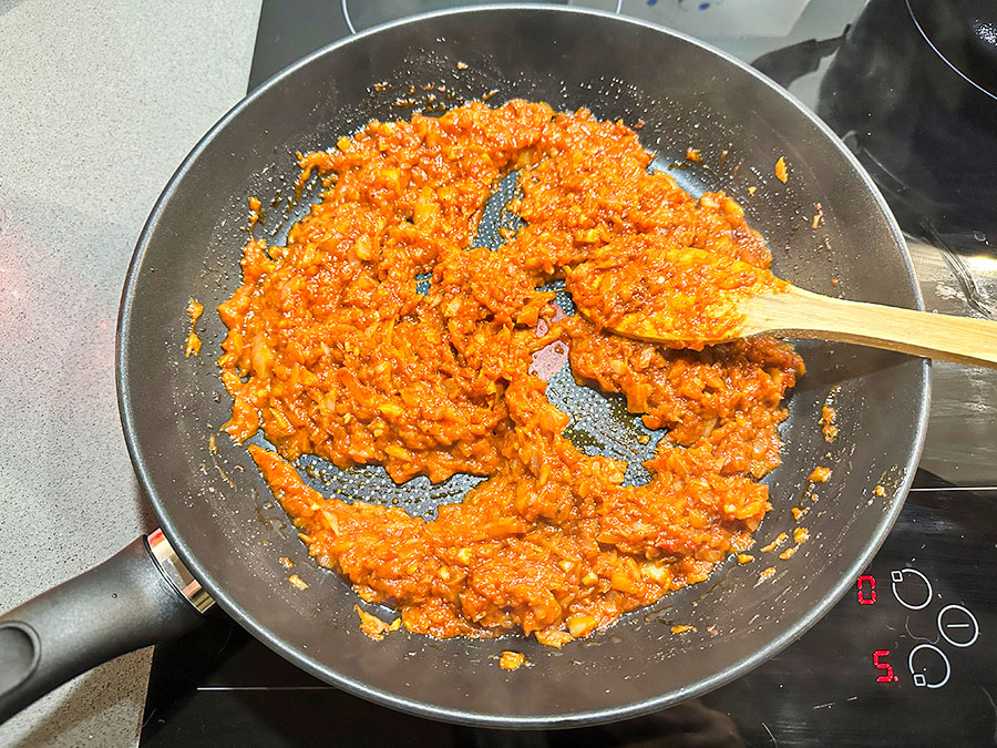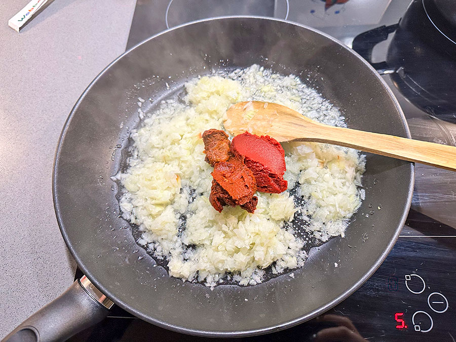Meanwhile, heat the vegetable oil in a frying pan over medium heat. Add the chopped onion and sauté until soft and lightly golden. Add the garlic and cook for a further minute, then stir in the tomato and red pepper paste (biber salçası) and cook for 1–2 minutes more. Remove from the heat.