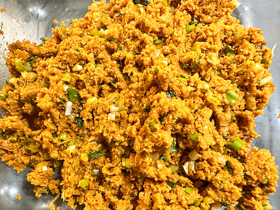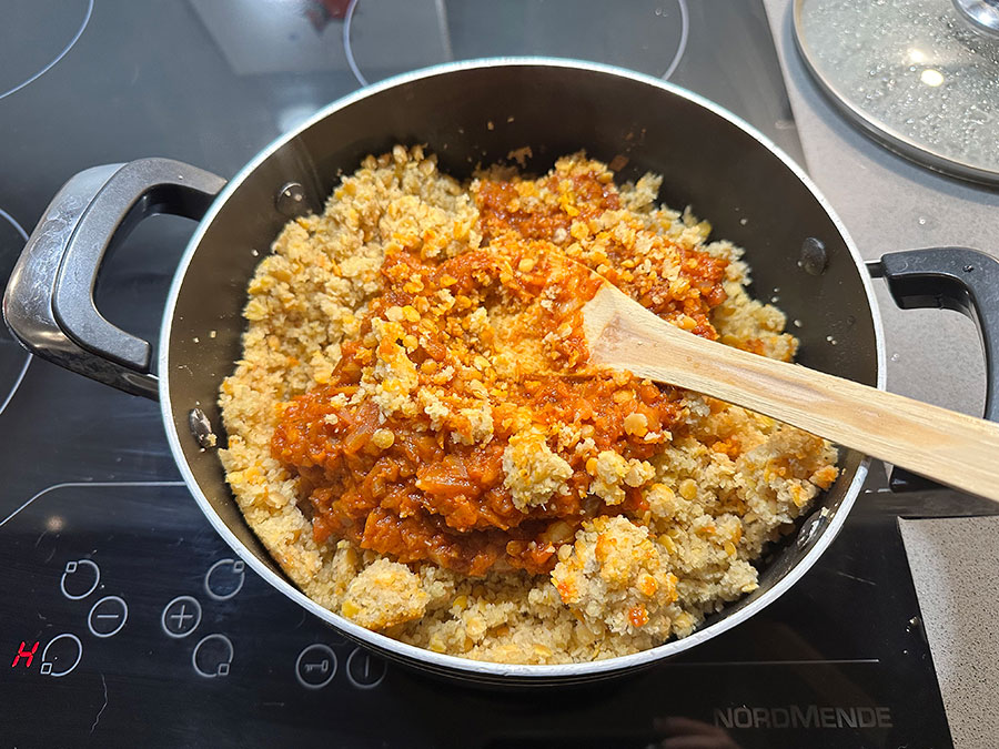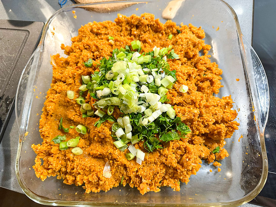 Add the onion and pepper paste mixture to the lentil and bulgur base. When the mixture has cooled slightly and is warm rather than hot, knead thoroughly by hand until well combined.